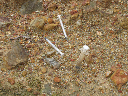 Những chiếc bơm kim tiêm vứt bừa bãi, la liệt trên bãi đất, nhiều chiếc còn dính máu, có chiếc nằm ở đây từ lâu, theo nước mưa đã trôi dạt, lan ra các vùng xung quanh, gây nguy hiểm cho những người dân nơi đây.