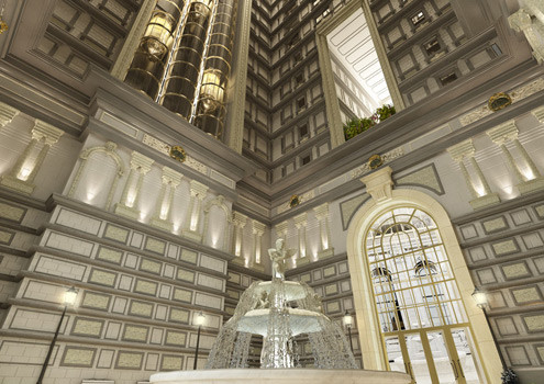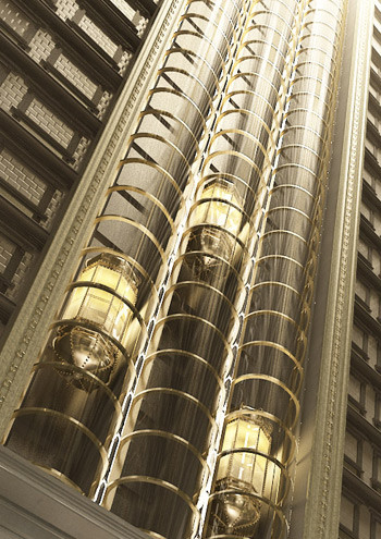 Thang máy quan sát xuyên sáng là một điểm nhấn của tòa nhà. Khung kính trong suốt với vỏ kính bọc ngoài được thiết kế tạo cảm giác giảm vận tốc di chuyển của thang cho phép người đi có thể ngắm nhìn những vườn cây nhỏ xinh trên cao hay những họa tiết, hoa văn trang trí bên trong tòa nhà.