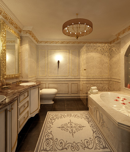 Phòng tắm tại căn hộ được mạ vàng 24K, sử dụng tại các tòa nhà nổi tiếng thế giới như The Ritz - Las Vegas, Hilton Club - NewYork. Men sứ được chế tác bằng tay, chịu được nhiệt độ cao, bền và sáng bóng. Bề mặt men bóng chống bám bẩn và trầy xước.