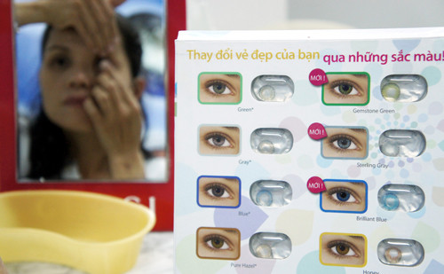 Kính sát tròng đủ màu (không độ cận) là mốt của một số bạn trẻ vì có thể “hô biến” tròng đen thành xanh, xám, nâu, tím...