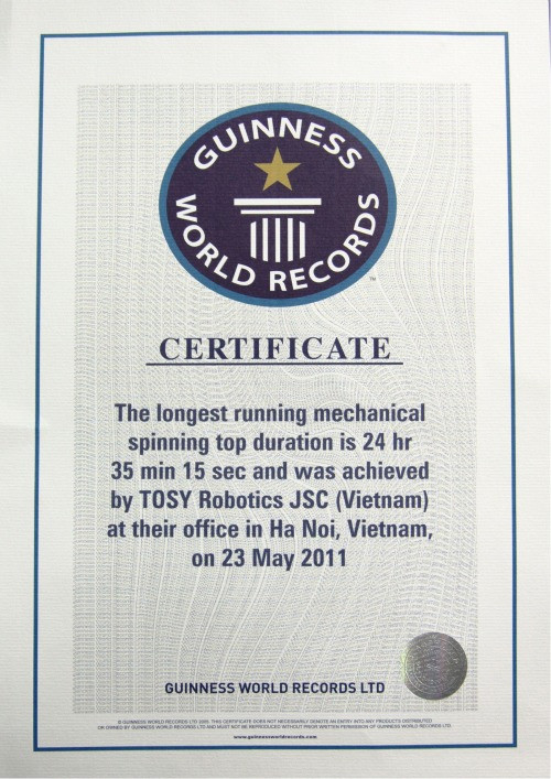 Với thời gian quay liên tục trong 24 giờ 35 phút và 15 giây, con quay Tosy đã vinh dự trở thành sản phẩm đồ chơi Việt Nam đầu tiên được Tổ chức Guinness trao tặng kỷ lục thế giới.