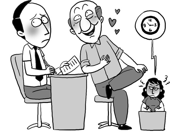 Chú P là trưởng phòng cũ của tôi, mới nghỉ hưu được nửa năm nhưng lại bị mắc bệnh "yêu cơ quan" đến mức hầu như ngày nào cũng đến ngồi cà kê cả buổi. Chú ấy lại là người giới thiệu tôi về đây nên mọi người có vẻ rất khó chịu với tôi, có người ác mồm còn đồn chú ấy nhớ tôi nên cứ đến. Mệt quá…!? Nguyễn Nụ (Hòa Bình)