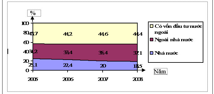 - Nhìn chung cơ cấu giá trị sản xuất công nghiệp phân theo thành phần kinh tế của nước ta không cân đối và thay đổi từ năm 2005 đến năm 2008.