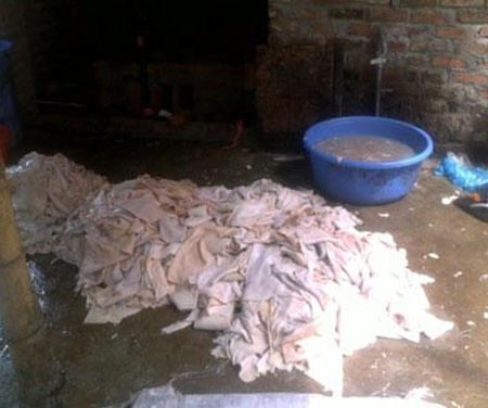 Tại một cơ sở sản xuất bóng bì và mỡ lợn, nhiều đống bì lợn bèo nhèo, đã bốc mùi hôi thối “vứt” bừa bãi dưới nền giếng bẩn, ẩm ướt, phân gà, bụi than từ cái bếp than tự chế để rán mỡ ngay bên cạnh. Bì lợn thì được ngâm qua dung dịch để làm trắng, sau đó sấy khô thành bóng bì cung cấp cho các hàng lẩu, các cửa hàng bán đồ khô.