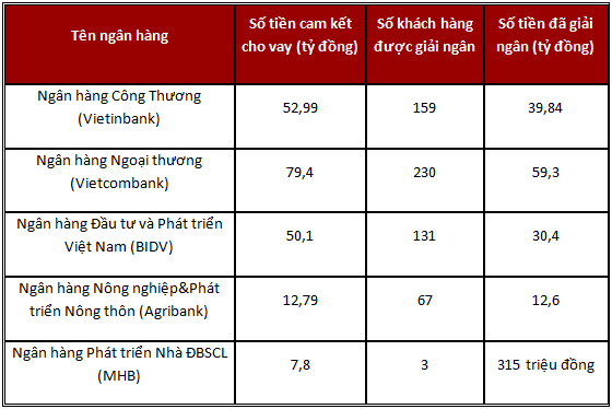 Theo số liệu của Vụ Tín dụng Ngân hàng Nhà nước, đến ngày 30/9, tổng số tiền các ngân hàng đã cam kết cho vay theo Chương trình hỗ trợ nhà ở đối với khách hàng cá nhân là 619 hồ sơ, với số tiền là 203 tỷ đồng; trong đó đã giải ngân cho 590 khách hàng với số tiền là 142,5 tỷ đồng.