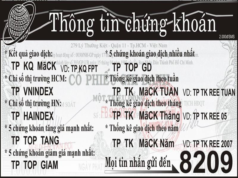 | Nhắn tin để biết thị trường chứng khoán Công ty Cổ phần phát triển Công nghệ Hà Thành và báo Tiền phong phối hợp thực hiện dịch vụ nhắn tin qua đầu số 8209 để biết 9 thông tin cơ bản trên thị trường chứng khoán. 9 thông tin đó gồm: 1. Kết quả giao dịch; 2. Chỉ số thị trường TP HCM; 3. Chỉ số thị trường Hà Nội; 4. 5 chứng khoán tăng giá mạnh nhất;5. 5 chứng khoán giảm giá mạnh nhất; 6. 5 chứng khoán giao dịch nhiều nhất; 7. Thống kê giao dịch theo tuần; 8. Thống kê giao dịch theo tháng; 9. Thống kê giao dịch theo năm. Bạn đọc soạn tin theo cú pháp như hướng dẫn của bảng dưới đây rồi gửi đến số 8209. Mức cước phải trả là 2.000 đồng/bản tin.