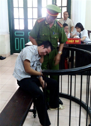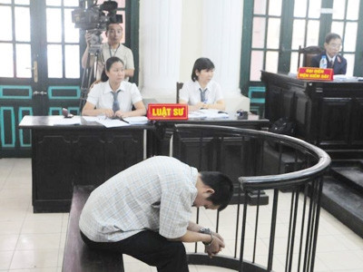 | Bị cáo Đặng Trần Hoài cúi gằm mặt, run rẩy trước vành móng ngựa. |