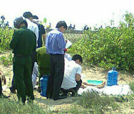 Trên người nạn nhân chỉ mặc áo sơ mi và quần lót, mặt phủ đầy cát và che đi bằng một chiếc áo thể thao màu đỏ, trong túi áo có hai cái khẩu trang, chân đi dép tổ ong.