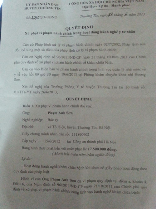 Trước đó vào tháng 6/2013, UBND huyện Thường Tín đã có văn bản xử phạt hành chính 17,5 triệu đồng đối với phòng khám Hương Sơn tại phố Tía, Thường Tín, Hà Nội. Lý do ông Sơn đã hành nghề khám chữa bệnh khi chưa có giấy phép hành nghề theo quy định của pháp luật. Hành vi của ông Sơn đã vi phạm quy định tại điểm a, khoản 4, điều 6 của Nghị định số 96/2011/NĐ-CP ngày 21/10/2011 của Chính phủ, quy định về xử phạt hành chính trong lĩnh vực hành nghề khám chữa bệnh.