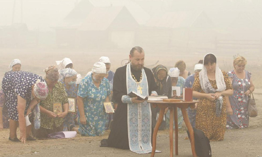 Những người tham gia lễ cầu mưa nhằm dập tắt các đám cháy rừng tại một ngôi làng ở Kriusha (Nga) hôm 7-8.