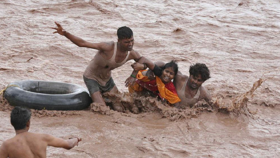 Nhân viên cứu hộ đang dốc sức cứu một người phụ nữ lên bờ sông Ghaghar sau trận lụt nghiêm trọng ở bang Haryana thuộc bắc Ấn Độ ngày 8-9.
