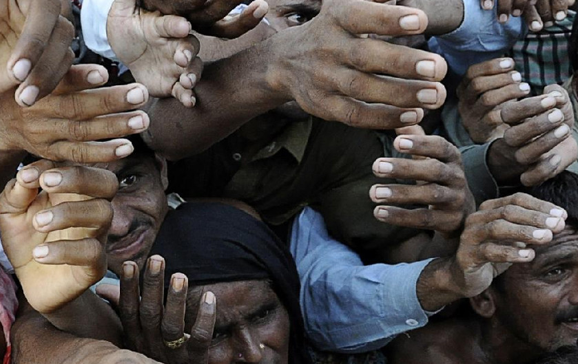 Những cánh tay của các nạn nhân trong trận lũ lụt tại tỉnh Punjab của Pakistan đang cố len lỏi để nhận thực phẩm cứu trợ sau khi trận lụt khủng khiếp tràn qua nước này ngày 21- 8.