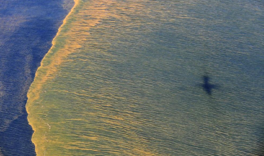 Một góc mặt biển vùng vịnh Mexico bị lớp dầu phủ khi giếng dầu của công ty Deepwater Horizon bị tràn ra ngoài bờ biển Mobile, bang Alabama, ngày 6-5.