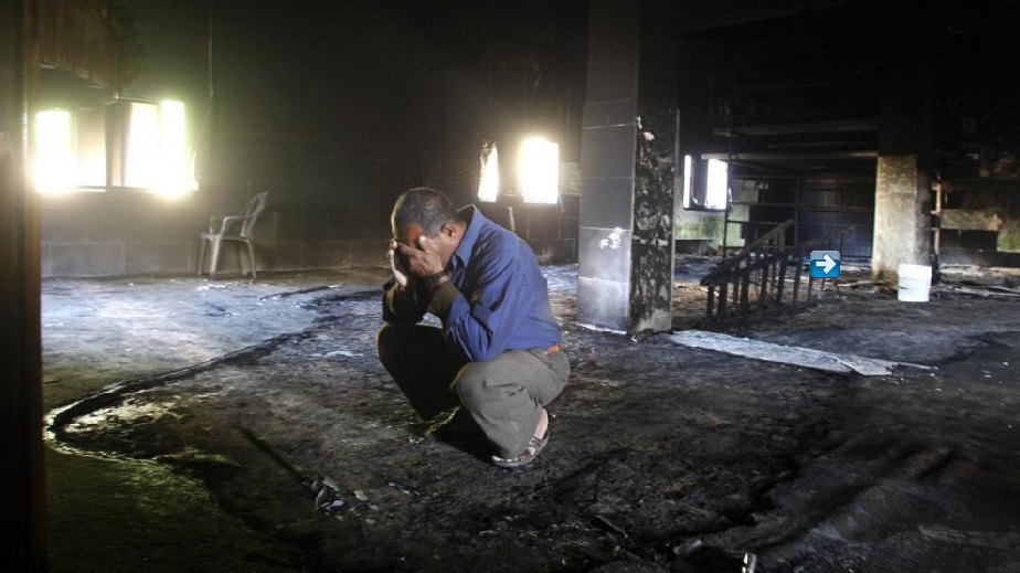 Sự đau khổ của một người Palestine trước một đền thờ Hồi giáo bị phá hủy trong trận hỏa hoạn ở Bờ Tây ngày 4-5.
