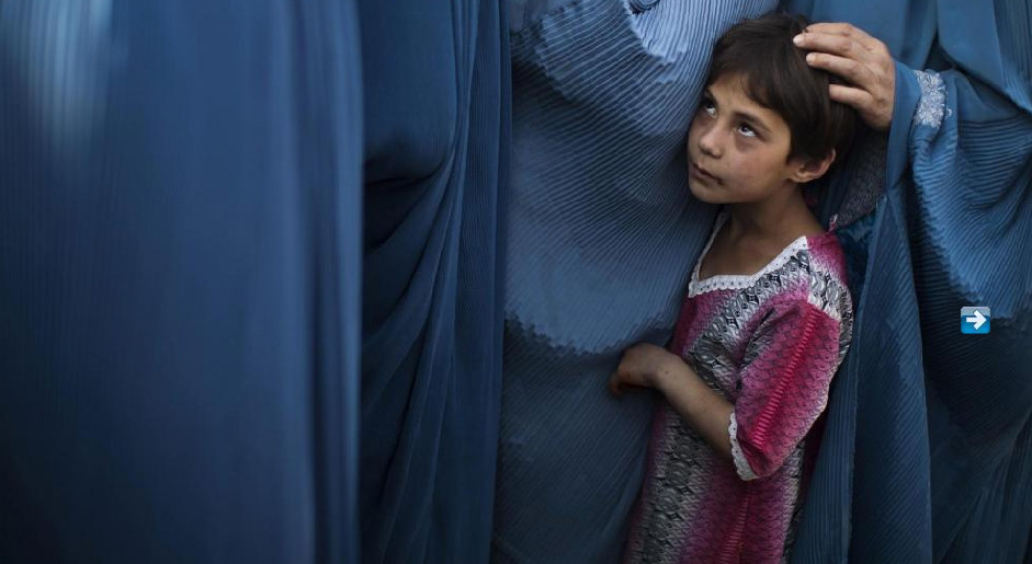 Một bé gái Afghanistan nép cạnh mẹ chờ nhận lương thực cứu trợ ở thủ đô Kabul ngày 14 - 9