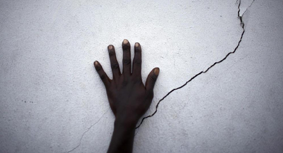 Bày tay của một phụ nữ đặt lên vết nứt của bức tường khi đợi thức ăn cứu trợ ở thủ đô Port-au-Prince của Haiti ngày 27-1. Hàng trăm nghìn người thiệt mạng trong trận động đất kinh hoàng này.