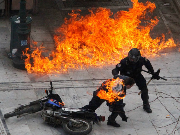 Cảnh hỗn loạn diễn ra trong khói bụi mù mịt ở quảng trườngSyntagma. Ít nhất năm người bị thương, trong đó một cảnh sát bị trúng bom xăng cháy khắp người. Rất may, các đồng nghiệp của anh này chạy tới chữa cháy kịp thời.