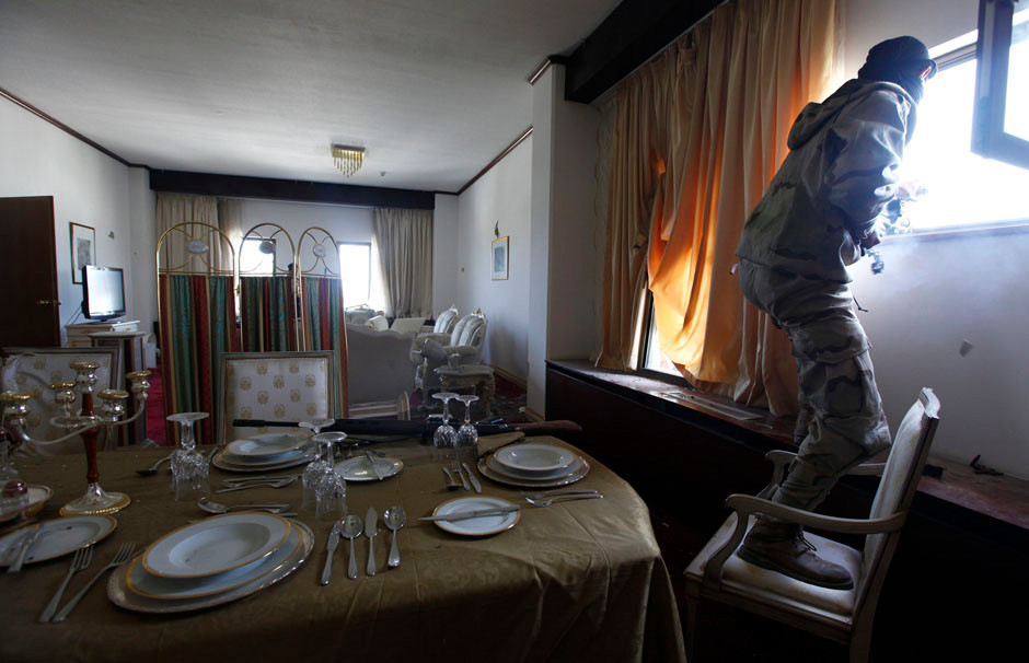 7. Một binh lính của quân nổi dậy Libya đứng ở cửa sổ của phòng ăn sang trọng của Gaddafi tại thành phố Sirte. Căn hộ này được sử dụng để đón khách nước ngoài dưới thời ông Gaddafi.