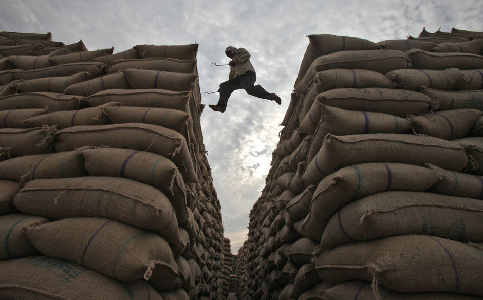 2. Một công nhân đang nhảy qua hai chồng bao tải bột mỳ và ngũ cốc tại thành phố Chandigarh, phía nam Ấn Độ. Hiện nay, giá lương thực của Ấn Độ đang tăng 9,32%.