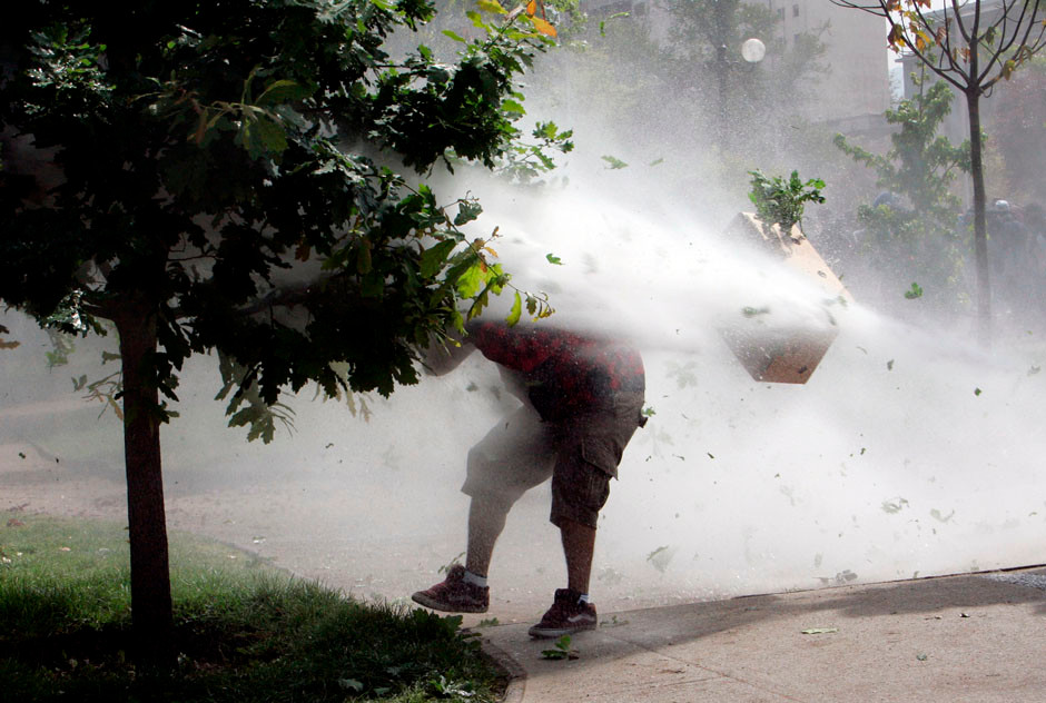 8. Sinh viên Chile đang bị một máy bay ném đạn khói để giải tán đoàn biểu tình. Tình trạng sinh viên biểu tình đòi cải cách giáo dục vẫn đang tiếp diễn tại Chile mà chính phủ vẫn chưa đưa ra biện pháp khắc phục.