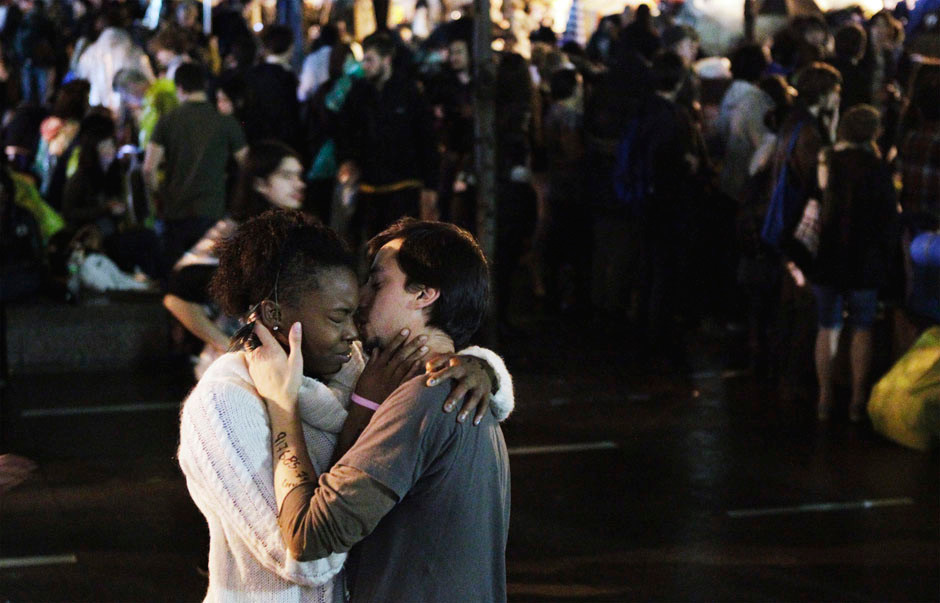 1. Phong trào “Chiếm giữ phố Wall” đang lan rộng khắp thế giới. Trong những giây phút ồn ào, mệt mỏi nhất, người biểu tình vẫn thể hiện tình cảm với nhau. Ảnh chụp tại thành phố New York (Mỹ).
