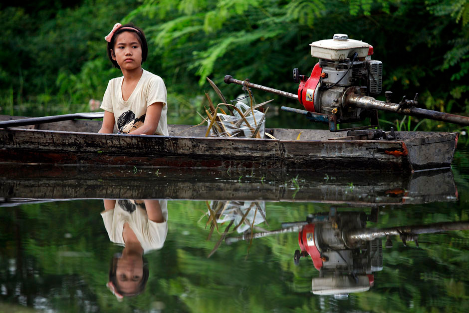 3. Một bé gái Thái Lan ngồi trên chiếc thuyền nhỏ in bóng xuống dòng sông khi đang trên đường sơ tán khỏi khu vực ngập lụt của tỉnh Ayutthaya. Hiện tại, Thái Lan đang phải vật lộn với trận lũ lụt kéo dài trong ba tháng làm ít nhất 283 người thiệt mạng và ảnh hưởng nặng tới kinh tế.