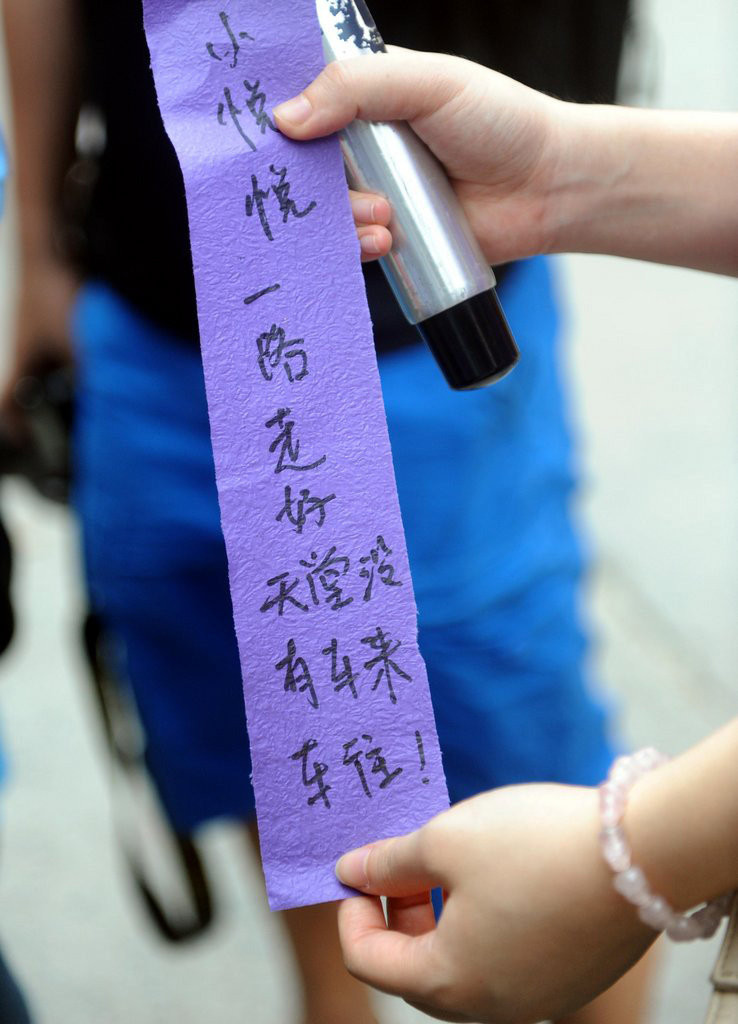Những lời cầu phúc cho em được viết vào giấy và thả lên trời, mong cho Duyêt Duyệt lên thiên đàng luôn được vui vẻ.