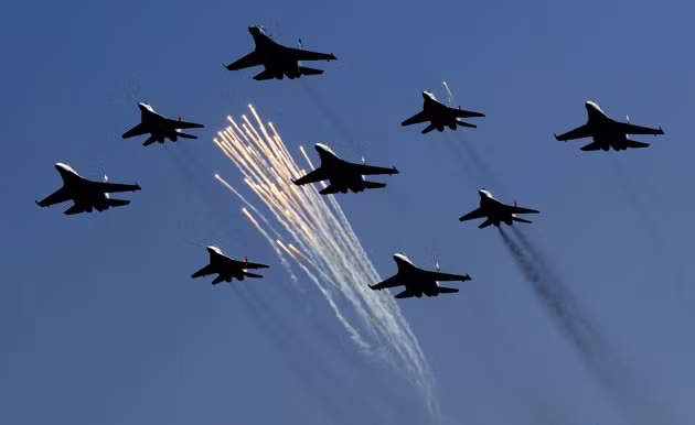 Đội máy bay biểu diễn gồm Su-27 và MiG-29 của Không quân Nga.