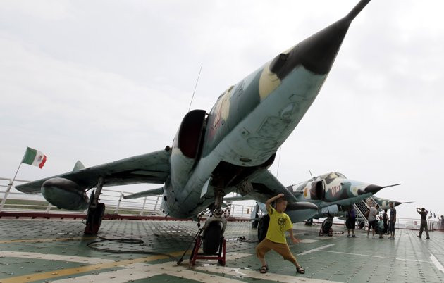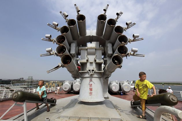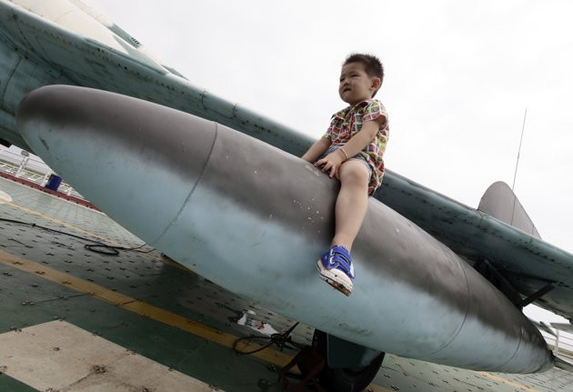 Nhiều phương tiện chiến tranh vẫn được lưu giữ làm kỷ niệm sau khi tháo hết các bộ phận nguy hiểm. Trong ảnh là những em bé chơi bên các loại vũ khí vang bóng một thời, từng được trang bị trên chiếc tàu sân bay.