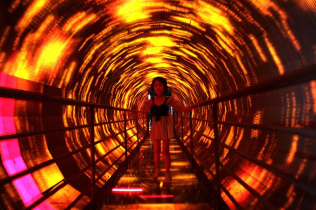 Một bé gái đứng trong đường hầm thử cảm giác chóng mặt trong khách sạn.