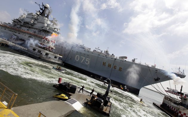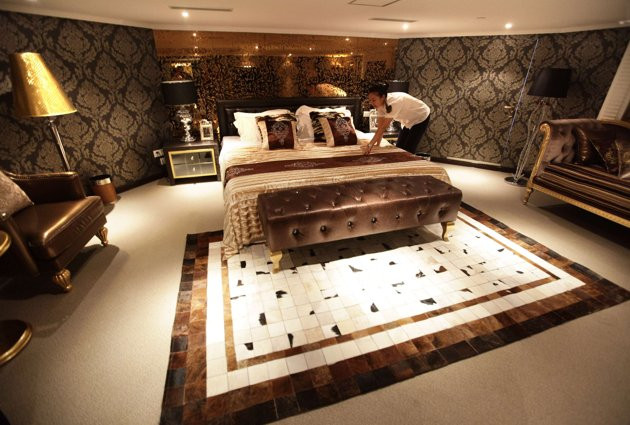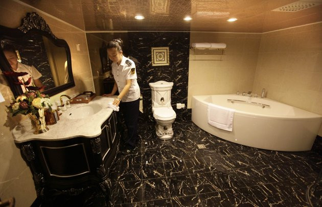 Chiếc tàu sân bay đang trong giai đoạn cuối chuyển mình từ phương tiện chiến tranh thành khách sạn hạng sang. Trong ảnh là một người phục vụ đang đứng trong căn phòng tổng thống trên khách sạn.