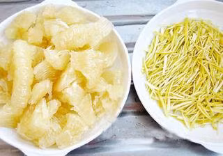 Với phần vỏ bưởi vừa bóc, dùng dao sắc lọc bỏ phần cùi trắng bên trong, chỉ để lại phần vỏ bưởi cứng màu vàng bên ngoài. Thái vỏ bưởi thành dạng sợi càng mỏng càng tốt rồi ngâm vỏ bưởi trong nước muối 1 tiếng.