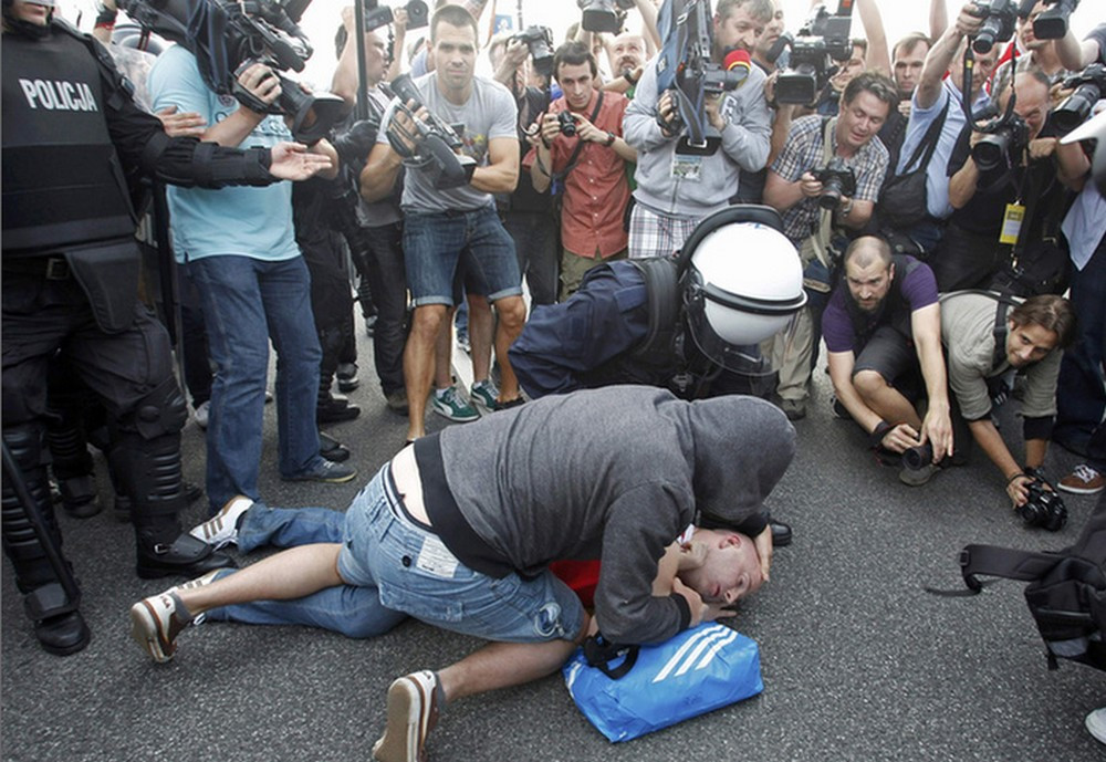 Đoàn CĐV Nga tuần hành trên đường phố nhân kỷ niệm Ngày Độc lập 12-6, với sự yểm trợ và bảo vệ của rất nhiều cảnh sát cơ động Ba Lan, khi lên tới chiếc cầu Poniatoiwski gần sân vận động đã bất ngờ bị vài trăm tên côn đồ Ba Lan chửi bới thậm tệ và hành hung thô bạo. Đám côn đồ còn không từ cả cảnh sát, khiến các nhân viên công lực phải dùng hơi cay, súng phun nước và cả súng đạn thật bắn chỉ thiên để ngừng những kẻ quá khích ném pháo và chai lọ vào họ.