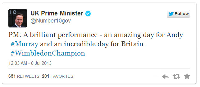 Ông viết: "Một màn trình diễn xuất sắc - một ngày tuyệt vời với Andy Murray và một ngày không thể tin được với Vương quốc Anh. Vô địch Wimbledon".