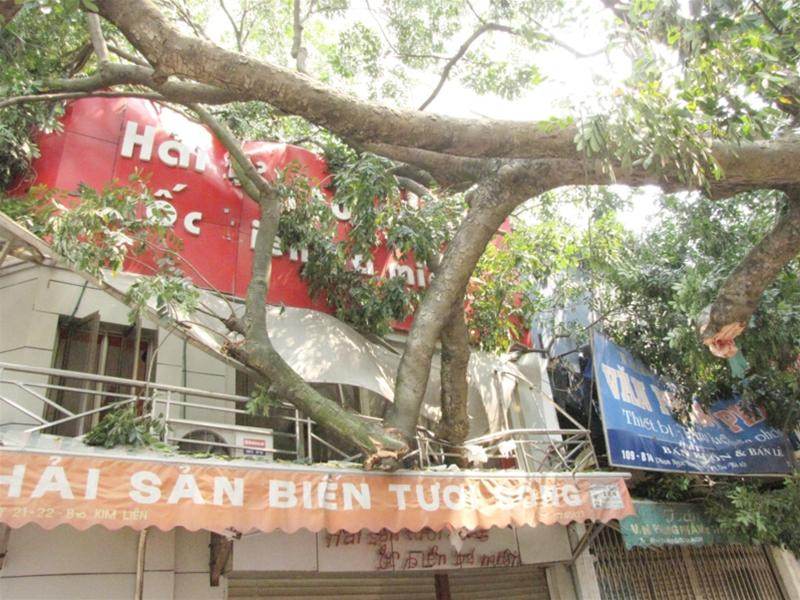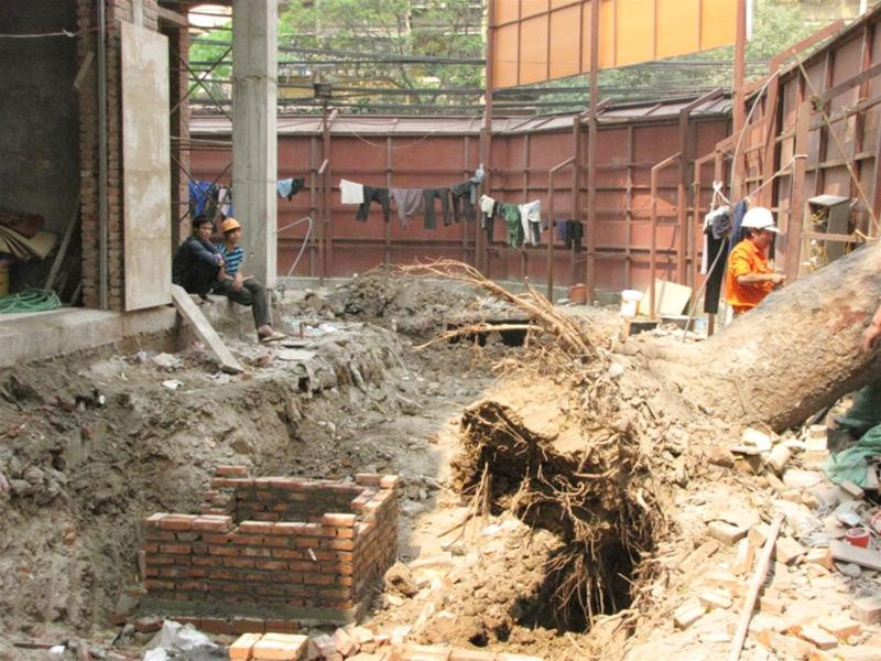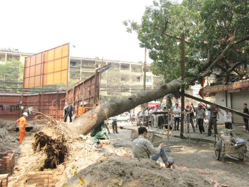 Trong quá trình thi công chiều qua, các công nhân đã đào một hố sâu hơn 1m, chặt 2/3 bộ rễ cây xà cừ khiến cây không đứng vững và từ từ đổ xuống ki - ốt số 21 – 22 B 10 Kim Liên và quầy Văn phòng phẩm 109 B14 Phạm Ngọc Thạch vào sáng nay.