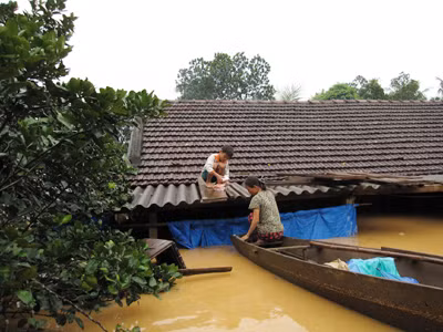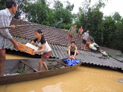 | Nước ngập, người dân Hà Tĩnh phải lên... mái nhà tránh lũ. |
