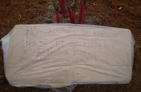 Đề phòng bị đào trộm mất mộ của người chị, người dân để lại cả số điện thoại và địa chỉ liên hệ.