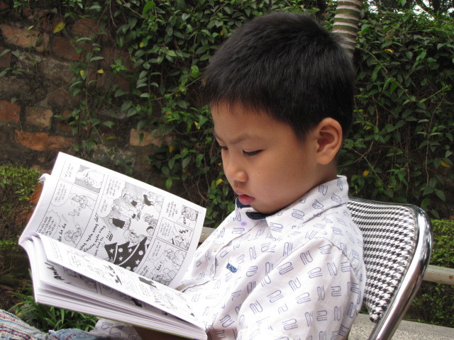 Các em nhỏ thích thú khi được mẹ mua tặng truyện tranh.
