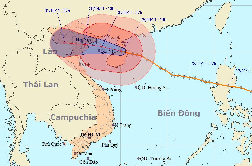Đường đi và vị trí cơn bão số 5. Nguồn: Trung tâm Dự báo khí tượng thủy văn T.Ư ngày 29-9.