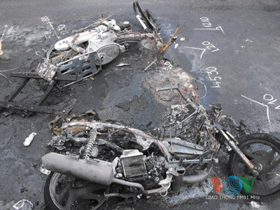 Tại hiện trường, hai xe máy bị thiêu rụi chỉ còn trơ khung sắt, nhiều vết dầu bị đổ tràn ra đường. Đám cháy còn làm 1 cột điện chiếu sáng công cộng gần đó bị cháy đen và một phần mái hiên nhà dân bị hư hỏng.