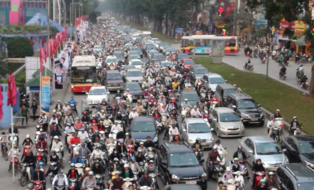 | Mới hơn 15 giờ chiều, đường La Thành đã xảy ra ùn tắc cục bộ. |