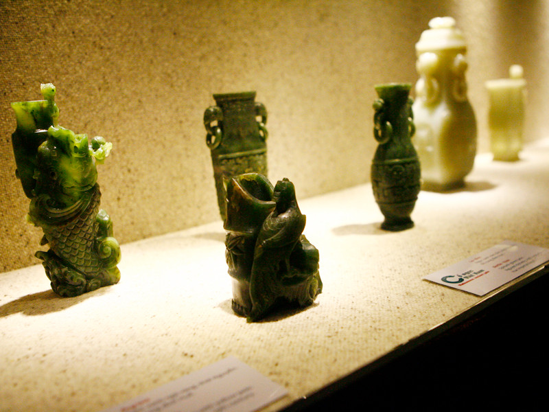 “Ấm chén, đồ dùng rất đẹp chứ tượng cũng thường thôi”, ông Đào Phan Long, Chủ tịch Hội cổ vật Thăng Long nói. Tượng Bát tiên bằng ngọc xanh trắng, đỏ nâu, xanh celadon, trắng xanh và đen trong nhiều tư thế, mô phỏng theo tích Trung Quốc.
