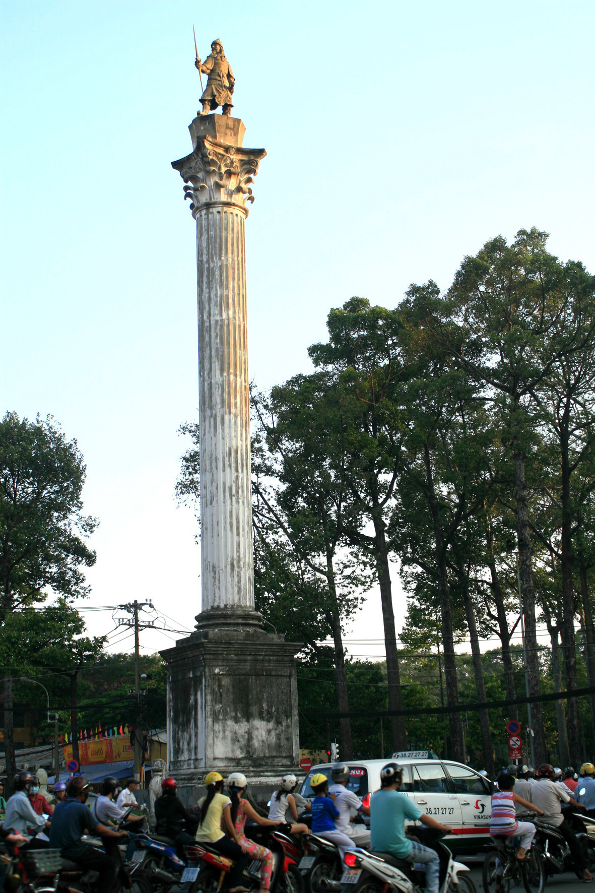Tượng đài Thánh Gióng (cuối ngã sáu Cách Mạng Tháng Tám) dù khá nhỏ, không phù hợp với tầm vóc của nhân vật, nhưng khối hình thù ấy vẫn đủ làm tối sầm một góc đường, giữa khung cảnh nhộn nhạo của một đoạn đường đông đúc. (ảnh 2: chụp chiều 9-8)