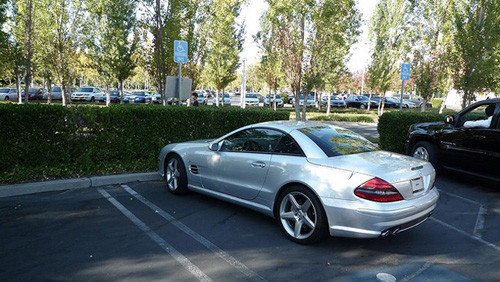 | Chiếc Mercedes-Benz SL55 AMG của Steve Jobs không được gắn biển số mà thay vào đó là bảng mã vạch. |