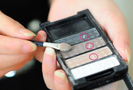 Bước 3: Viền sát mi mắt và đánh nhấn đuôi mắt bằng tông màu ghi xám. Sau đó dùng tông màu này viền 1/2 chân mi dưới kéo dài đến đuôi mắt.