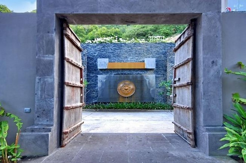 Cổng vào biệt thự làm bằng gỗ truyền thống và dẫn vào một khoảng sân nhỏ.