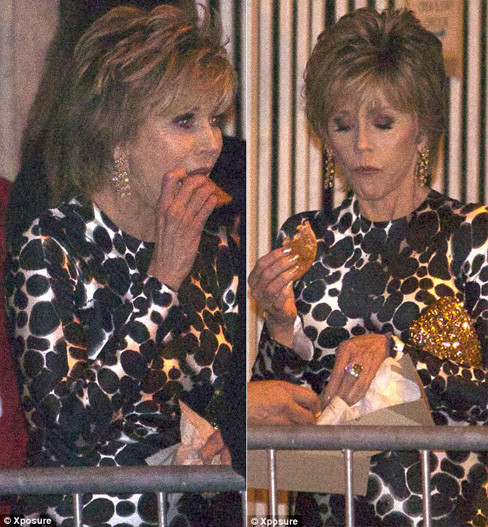Diện một bộ đầm da báo sành điệu, gương mặt được trang điểm cẩn thận nhưng nữ diễn viên gạo cội Jane Fonda chẳng ngoại 'nhồm nhoàm' gặm bánh vì quá đói.