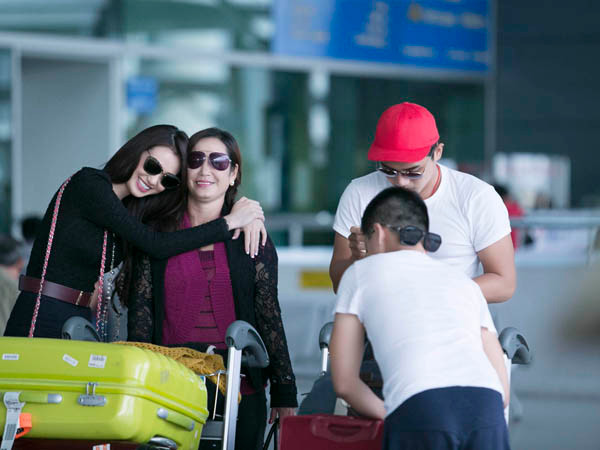 Xuất hiện tại sân bay Tân Sơn Nhất, mẹ của người đẹp phim "Váy hồng tầng 24" trẻ trung, sành điệu không kém gì con gái. Khánh My sống cùng nhà với chị gái nên hai chị em thân thiết và luôn giúp đỡ nhau trong công việc.