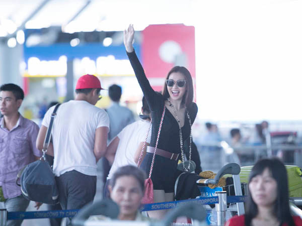 Riêng Khánh My, người đẹp chọn cả một cây đen rất sành điệu và năng động. Sự xuất hiện của nữ người mẫu xinh đẹp đã khiến một góc sân bay nhốn nháo khi cô khoe đôi chân thon dài thẳng tắp vô cùng gợi cảm và quyến rũ.