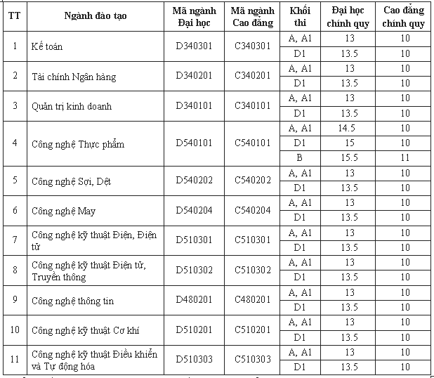 | 11 | Công nghệ thông tin | D480201 | A, A1 D1 | 13,5 14,0 |